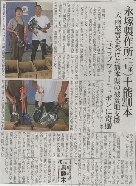 三條新聞に一般社団法人Love For Nipponに十能など寄贈